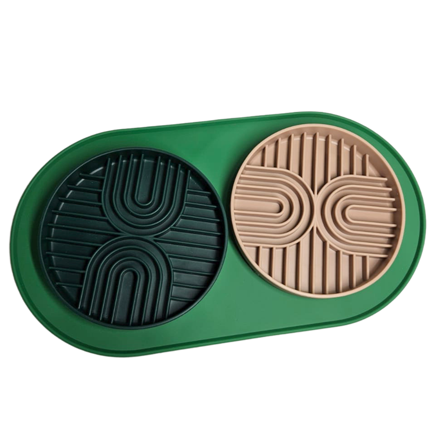 Big enough to fit two bowls comfortably, the raised edges prevent mess from escaping to the rest of your house. It combines great with Sobber’s slow feeder as the suction cup works on its surface. Also a great addition to any other bowl as it helps to prevent sliding while your pup eats.